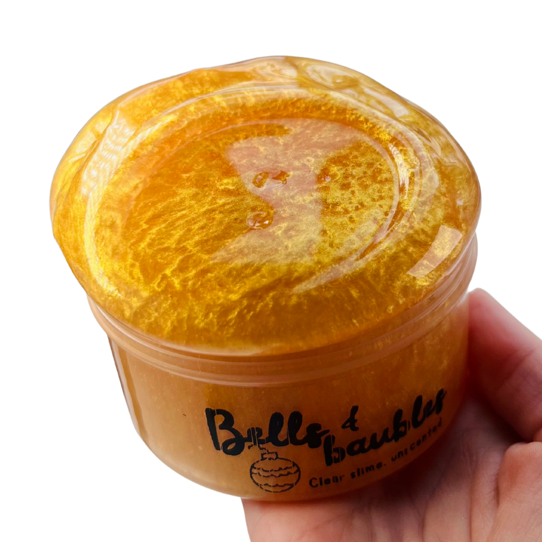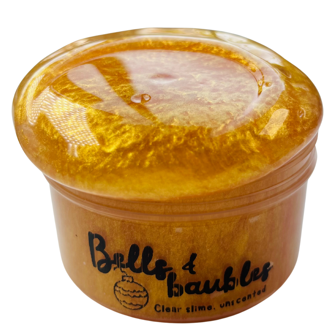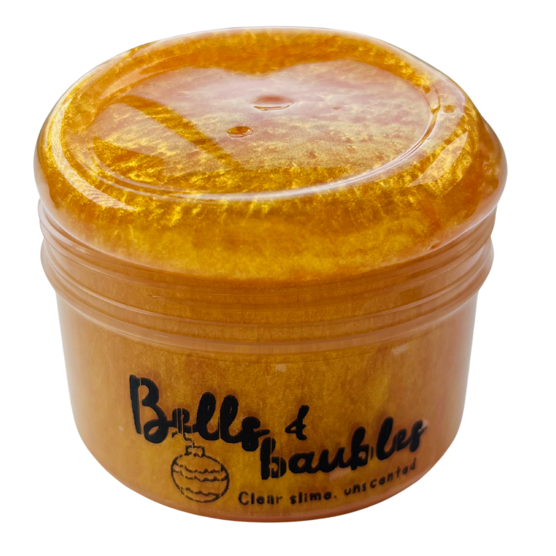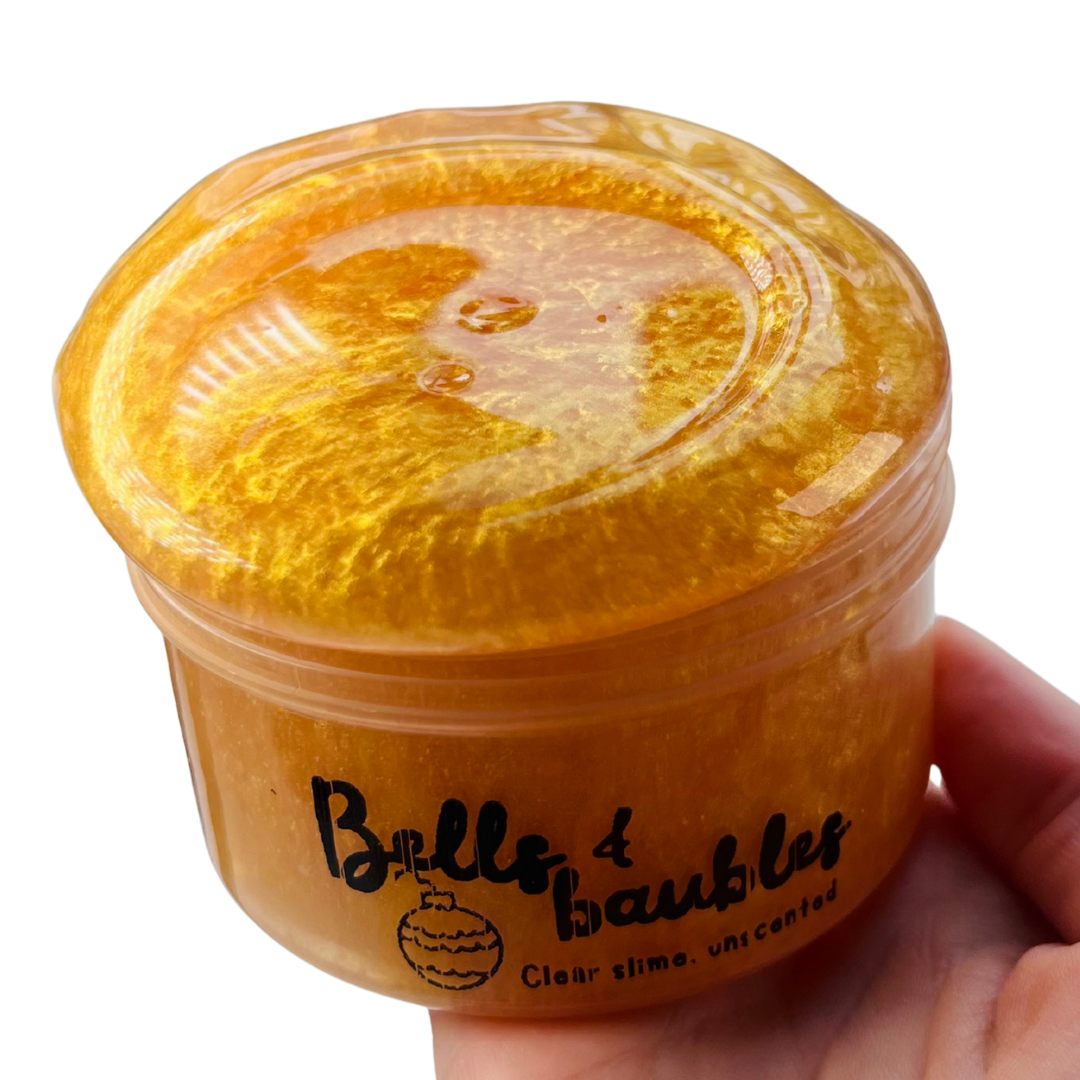 A shimmering gold clear slime inspired by Christmas baubles and decorations!