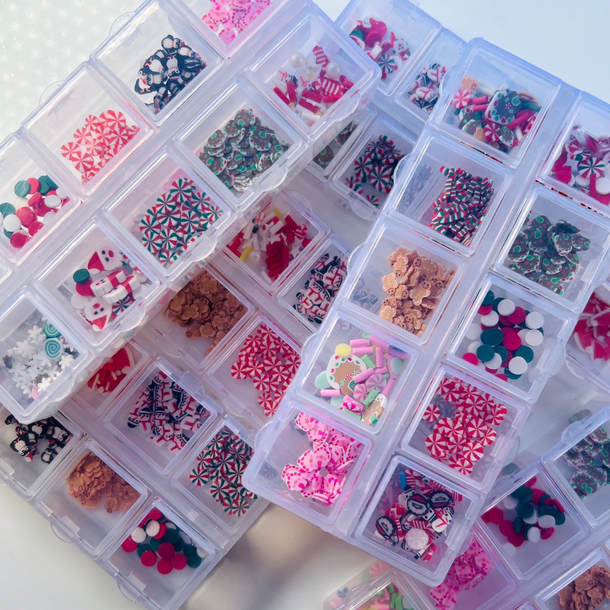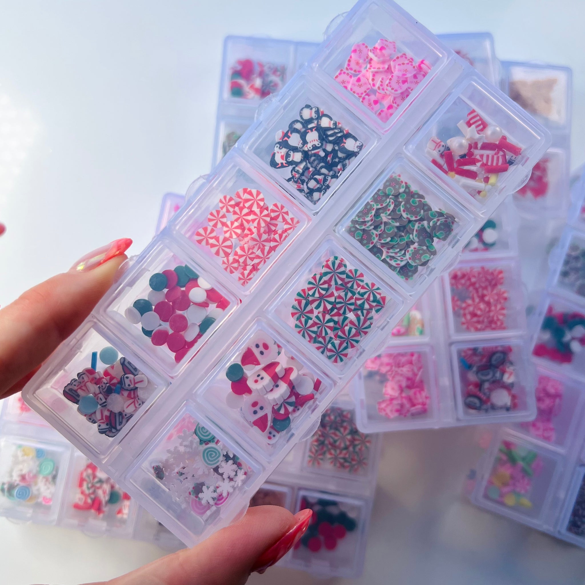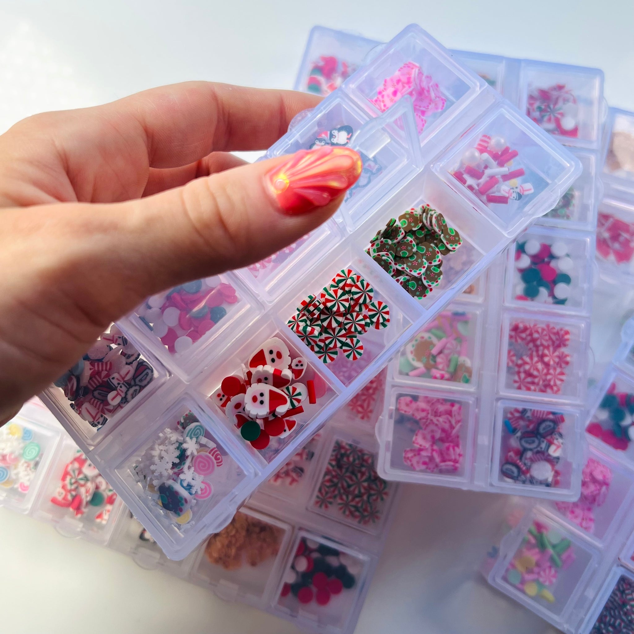 Get a mix of random Christmas themed sprinkles/glitter/fimo slices etc in this box! Each compartment in this box contains a quarter teaspoon of sprinkles, fimo slices or glitters. Add these decorations to your slime. PLEASE NOTE that we try and make each variety 10 pack unique and therefore no two packs will be exactly the same THEREFORE you may not receive the exact sprinkles etc shown in the gallery above. The pictures above are merely examples of what you could receive.